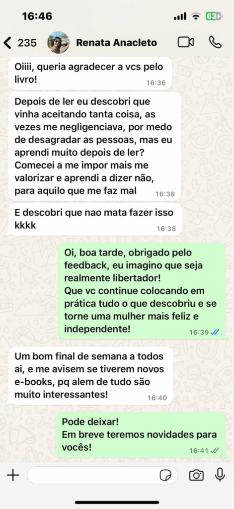 • E-book + Audiobook “Seja a Sua Melhor Escolha” — um guia prático e emocional que ensina como recuperar a confiança, se libertar da dependência emocional e voltar a se colocar em primeiro lugar.
